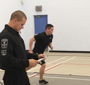 For individuals to receive the police fitness pin, you will be assessed on several physical fitness tests like. Upper and mid body muscular endurance, push-ups and core endurance tests; low back and hamstring flexibility, the sit and reach test; A test of aerobic power, in a maximal effort protocol utilizing running, the beep test. Each item is scored separately and a combined total of 75 points or higher is required to achieve the Police Fitness award.